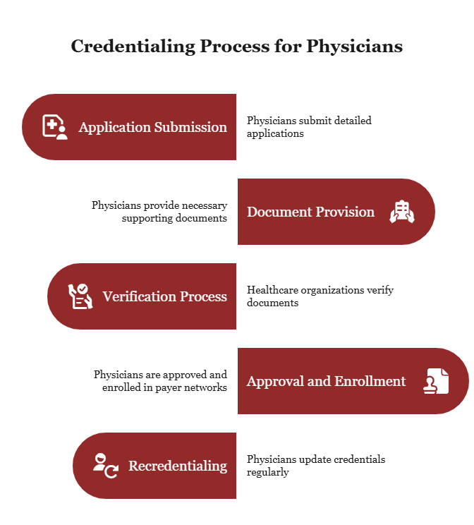 Credentialing process steps vary from one organization to another, but these are the key steps physicians must complete: