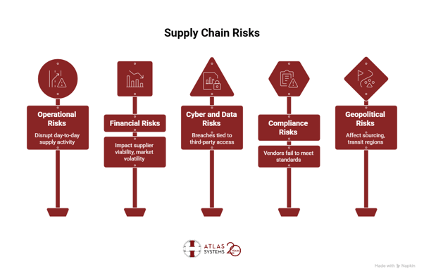 No supply chain is immune to disruption. What separates prepared organizations from exposed ones is their ability to recognize where the biggest risks come from and how those risks evolve over time. Based on industry standards (including NIST and ISO guidance) and our work with enterprise procurement and compliance teams, here are the core categories you need to monitor: