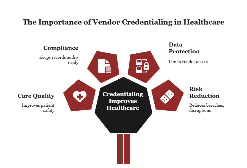 Vendor credentialing ensures only qualified third parties have access to an organization's data and systems, reducing the risk of security breaches, regulatory violations, patient safety incidents, and negative publicity. Thorough vendor vetting mitigates vulnerabilities and prevents disruptions to critical hospital operations.